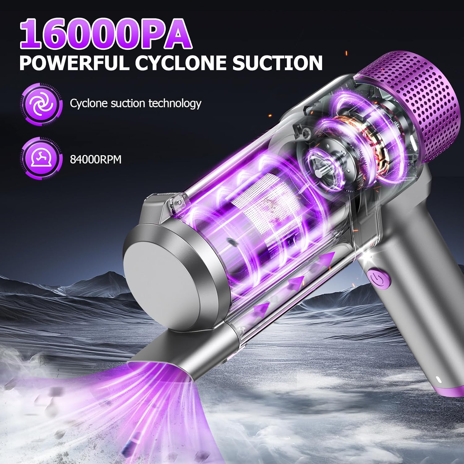 - đăPowerful 16000PA SuctionăCar vacuum cleaner is equipped with a 120W high power motor with a high motor speed of 84000RPM, providing a powerful suction of 16,000PA cyclone. It efficiently removes pet hair from sofa crevices, food crumbs on dining tables, and fine dust deep within carpets. Moreover, it maintains low noise level of 60dB while operating at high efficiency, making it suitable for use in homes, offices and cars