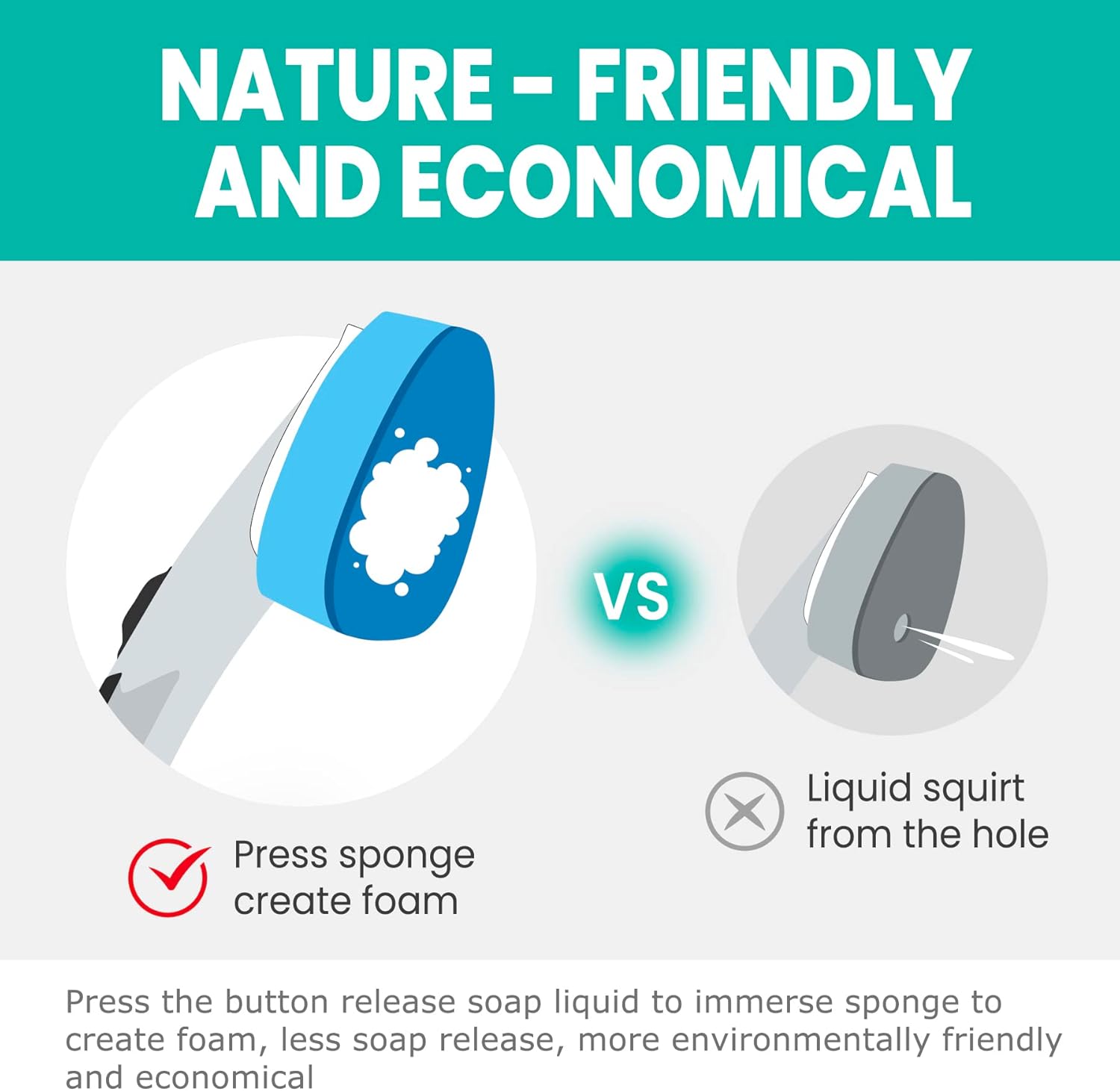 • Immerse Instead of Spraying Soap: We have eliminated the hole in the sponge's middle to prevent liquid leakage. For the first use, press the handle button about 10 times to soak the soap into the sponge, which will generate rich foam,making wiping easier