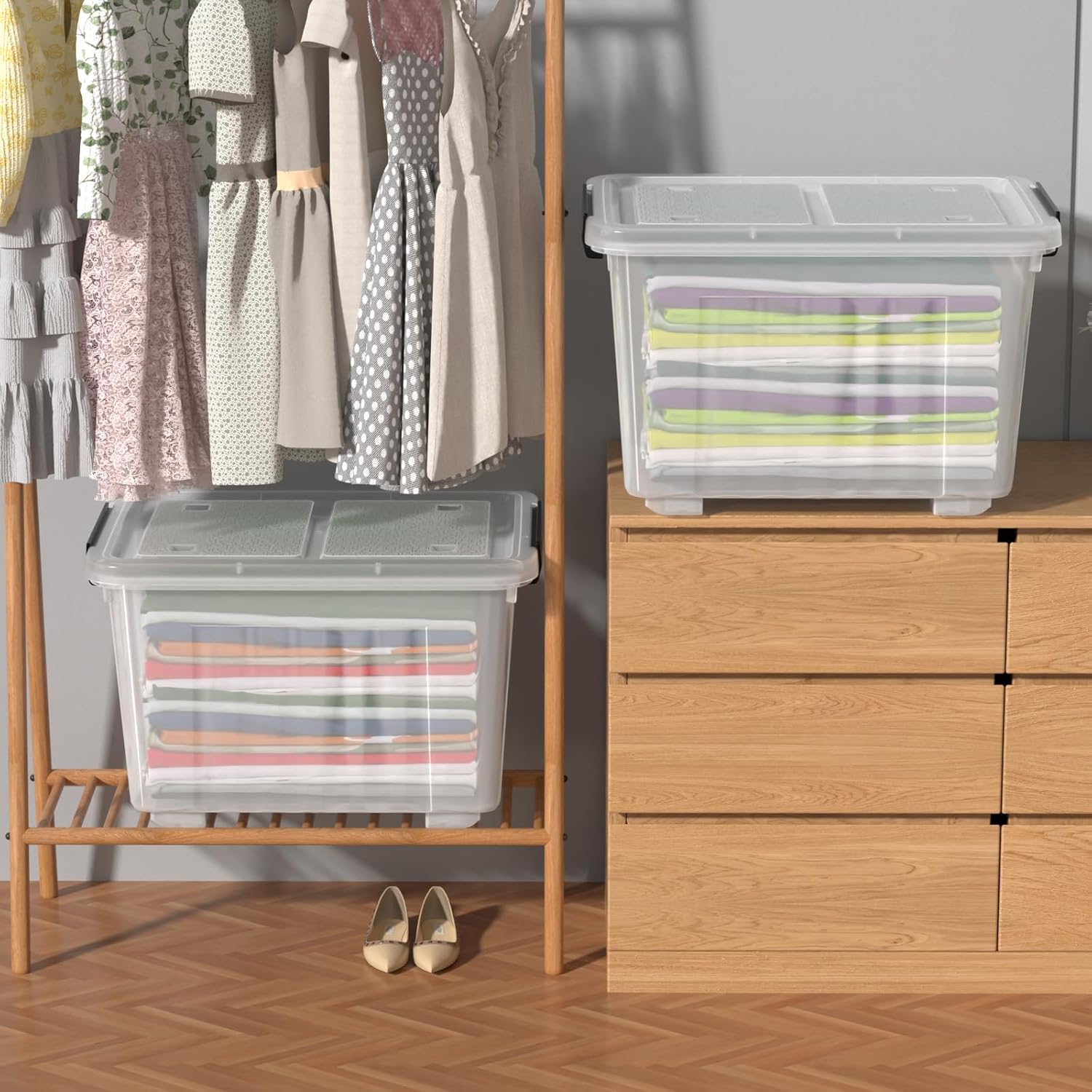 - The locking buckles on both sides firmly fix the lid, providing a safe and enclosed space, perfect for storing clothes, pillows, blankets, books, repair tools, daily necessities, holiday decorations, and other miscellaneous items