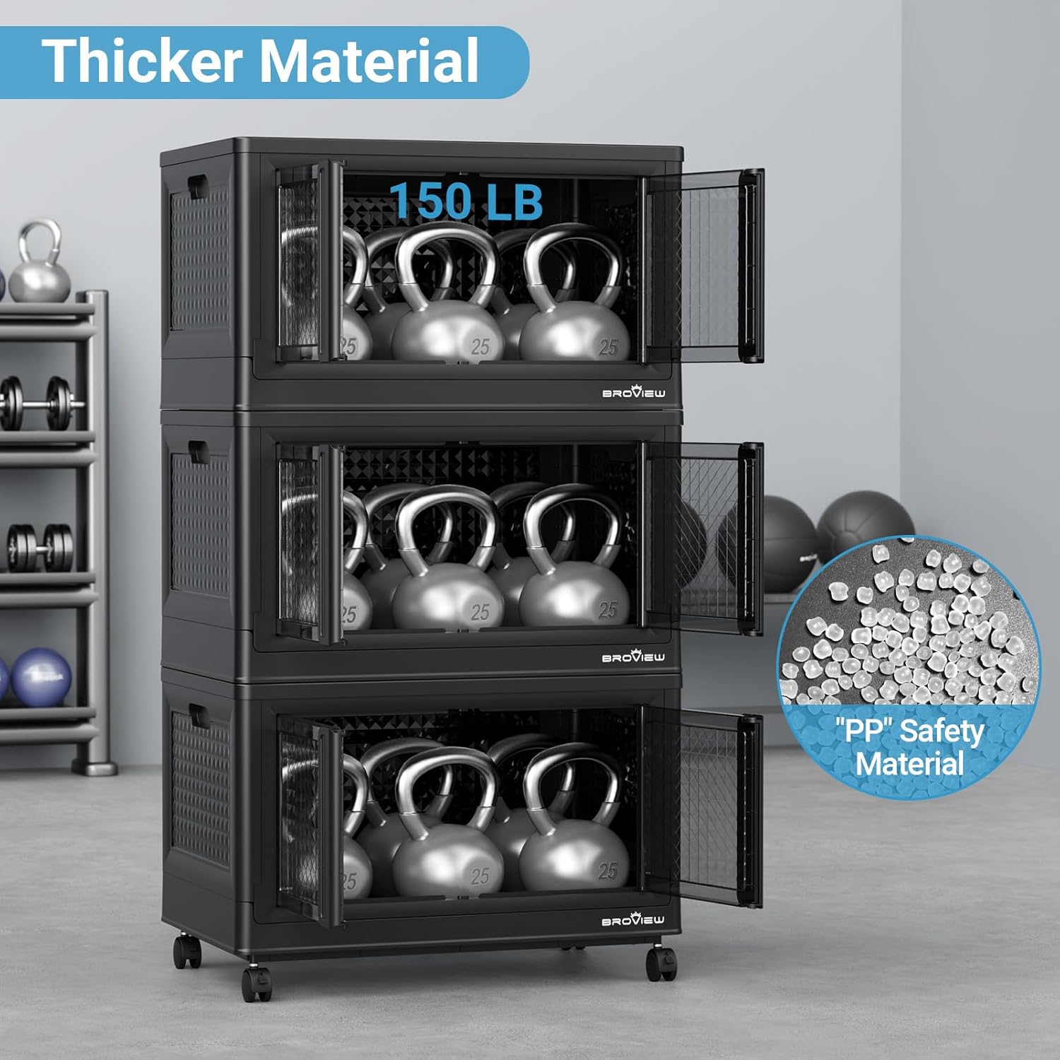 BROVIEW 160Gal Stackable Storage Bins with Lids & Wheels, 640Qt Plastic Collapsible Closet Organizer and Storage Drawers, Storage Boxes Cabinets for Home, Office, 8 Pack, Black