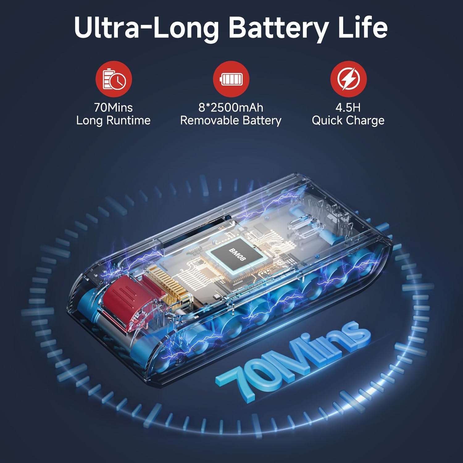 - Long-Lasting Detachable Battery for Uninterrupted Cleaning:Enjoy up to 70 minutes of cleaning time in Eco Mode with our cordless vacuum cleaner. The detachable battery allows you to charge it separately for maximum convenience, and its long-lasting performance ensures you can cover large areas in one go. Whether it's a quick tidy-up or an extensive vacuuming session, this rechargeable stick vacuum cordless has you covered