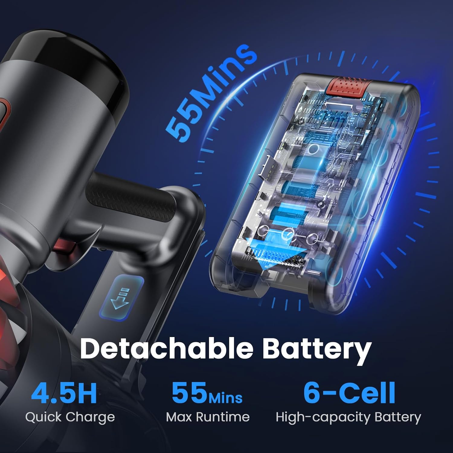 - 【Up to 55-Min Long Battery Life】Equipped with a 6-cell high-capacity rechargeable battery, this stick vacuum cordless rechargeable provides up to 55 minutes of uninterrupted cleaning (55 mins in Eco Mode, 25 mins in Strong Mode), ideal for large areas or multiple rooms. The detachable battery of the rechargeable vacuum cordless can be charged separately or on its main body (always use the original adapter for charging)