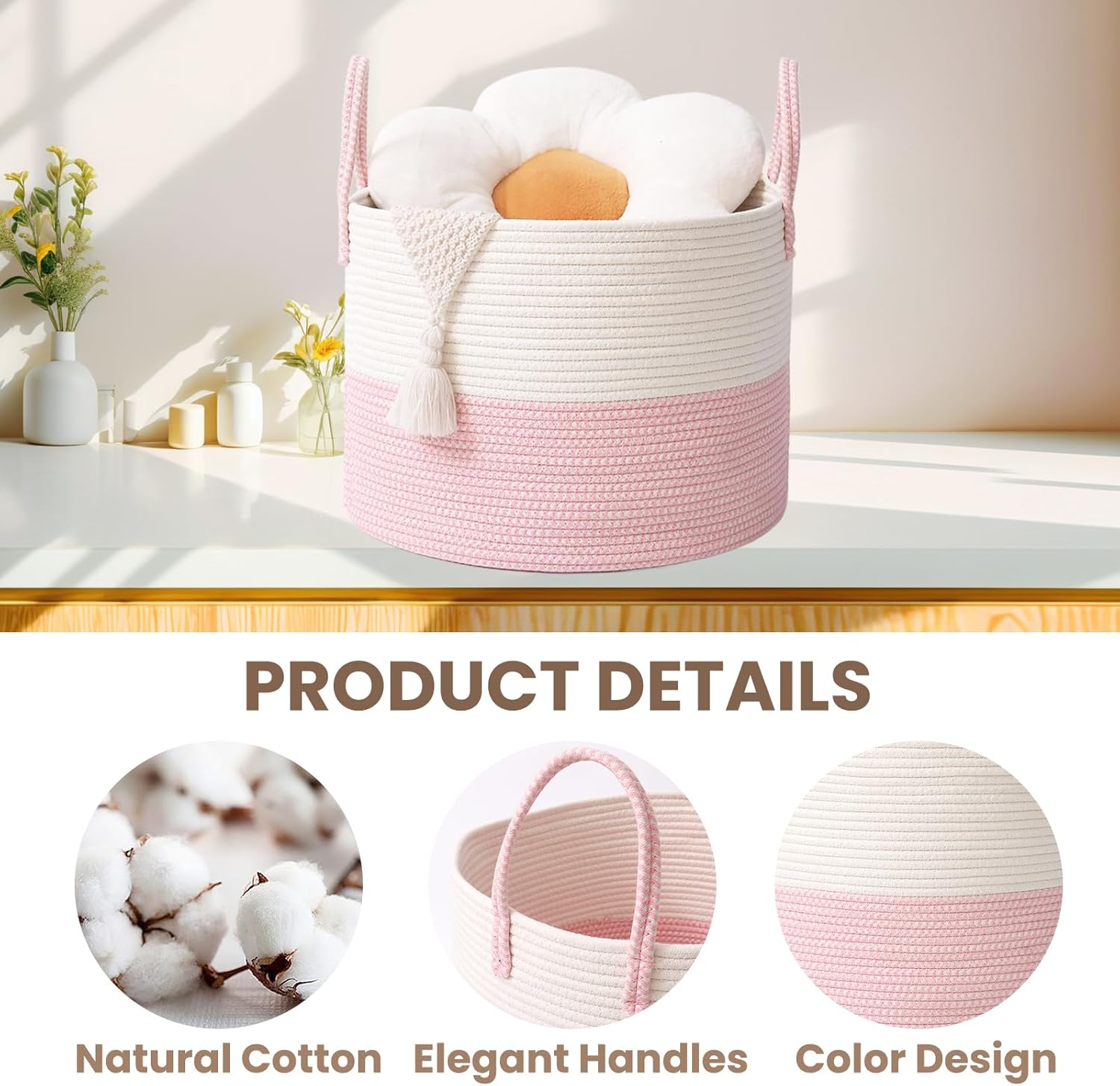 Woven Blanket Basket,65L Large Rope Storage Bin with Handles, Organizer for Blankets Toys Book and Clothes, Laundry Basket for Living Room Bedroom Nursery,White&Pink