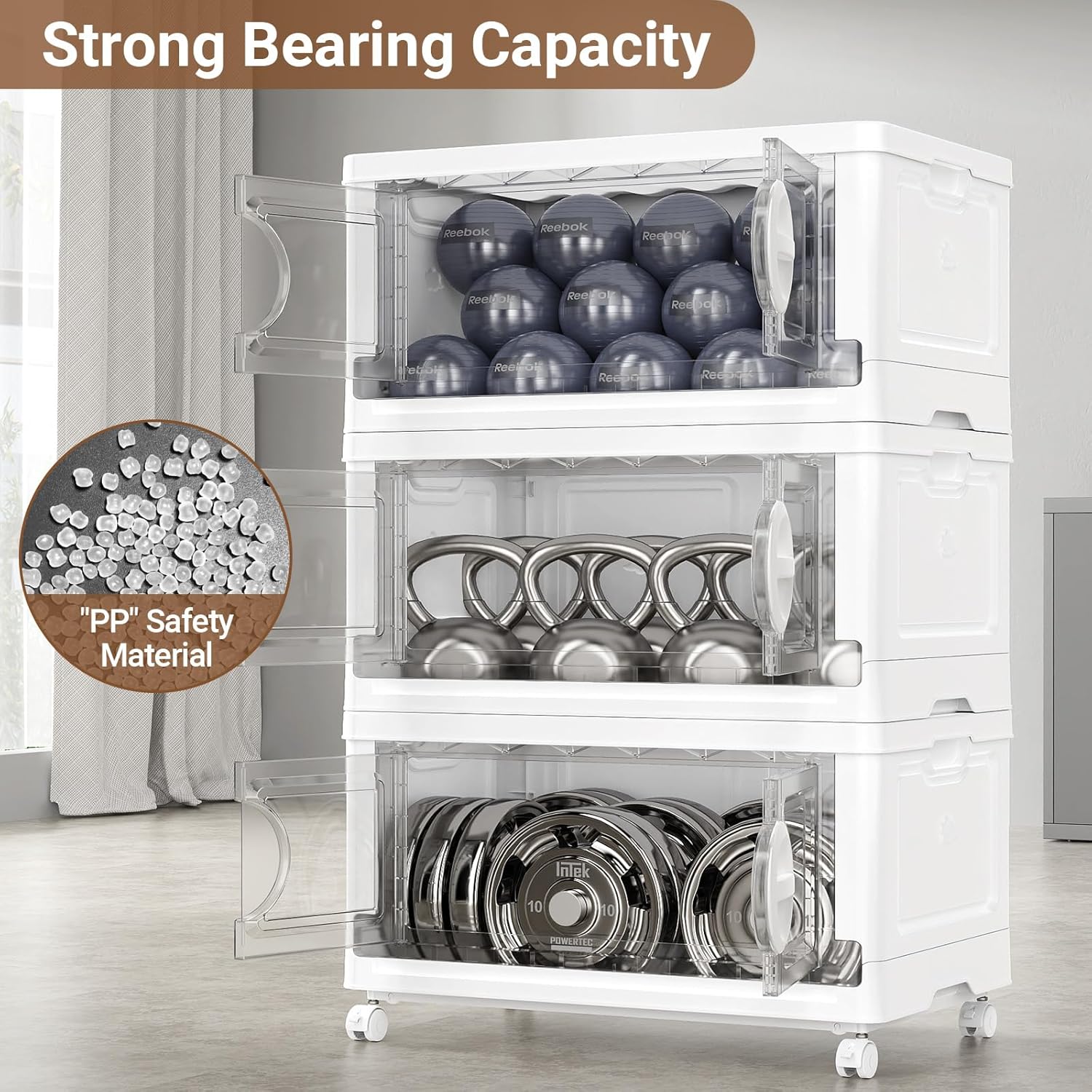 BROVIEW 360Qt Lockable Stackable Storage Bins with Lids, Closet Organizers and Storage Drawer, Collapsible Storage Bin with Wheels, Plastic Cabinet for Toy Clothes Dorm Organizer, V9 3 Pack White