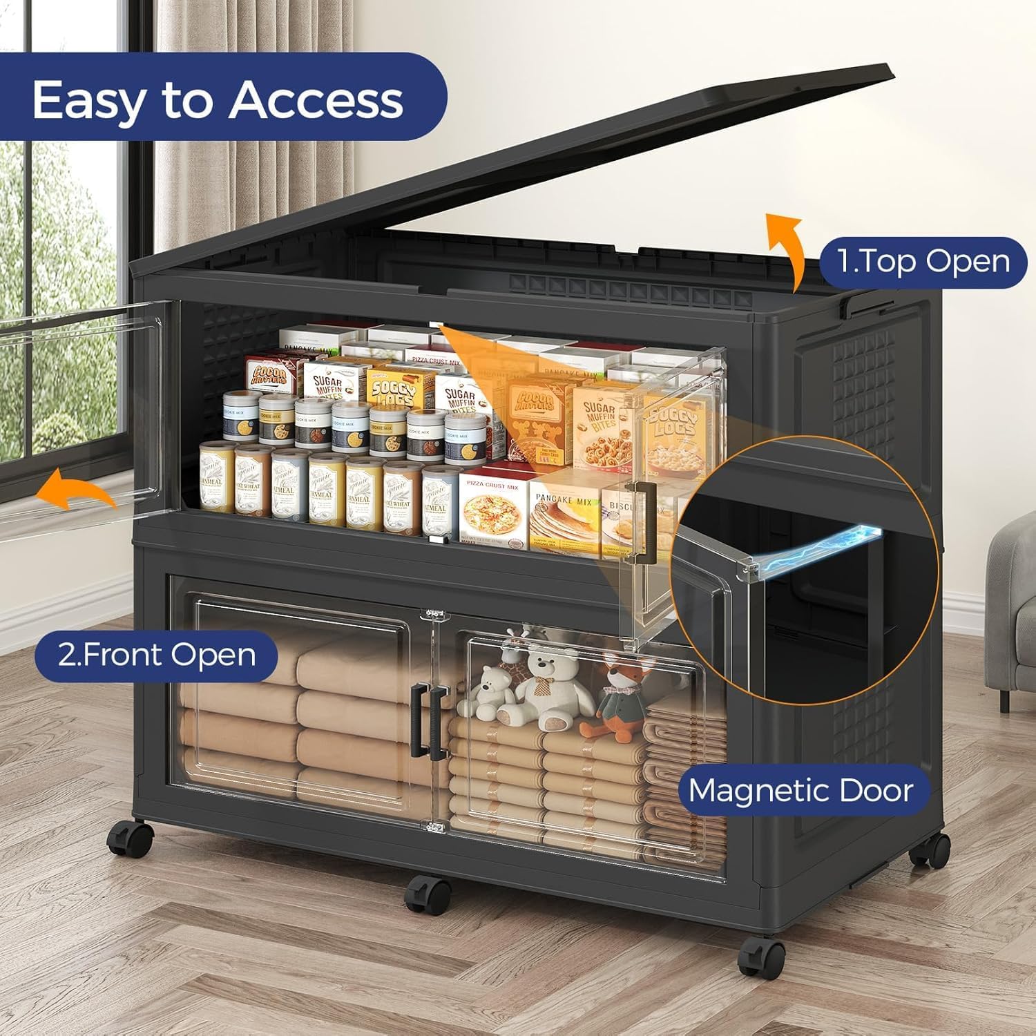- ăTwo Ways to Open & Clear Magnetic DoorăThe collapsible storage bins with lids and wheels feature a dual access way, allowing for both top and front door openings, and with clear windows for easy visibility. The stackable plastic storage bins with open front doors are equipped with magnetic lock buckles to prevent dust from entering the cabinet.