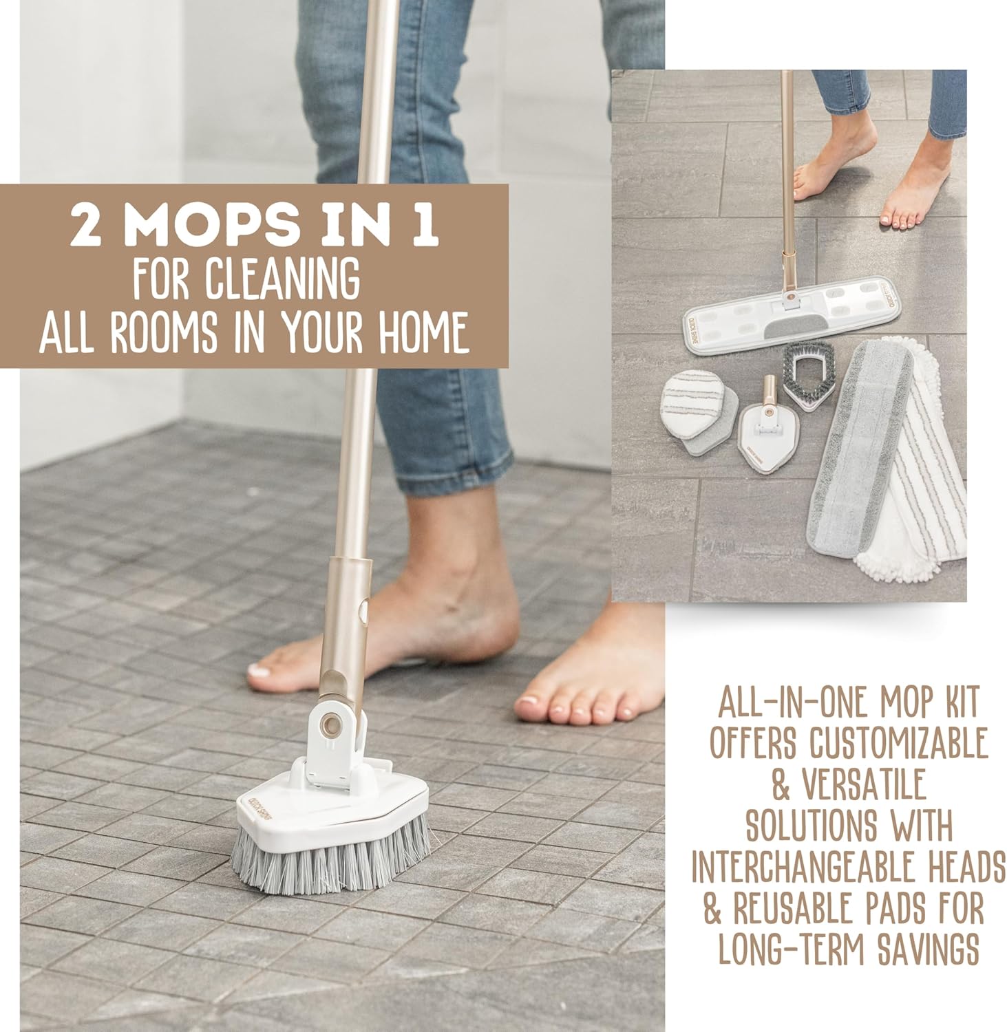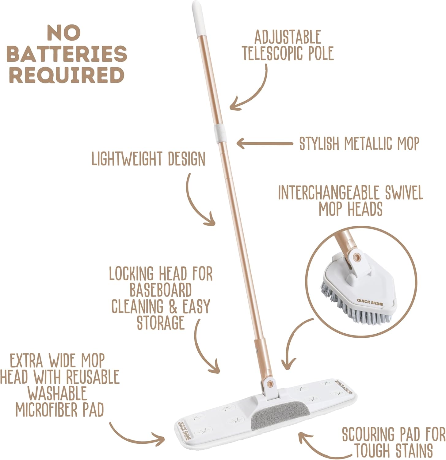 - Lightweight, Compact & Stylish: Features a sleek timeless metallic gold aluminum telescopic mop that’s easy to grab for quick cleanups, lightweight to carry room to room, and slim enough to store without sacrificing space; Locking mop head secures in place for upright storage and controlled baseboard or wall cleaning; Perfect for most hard surfaces: hardwood, laminate, luxury vinyl plank, tile and stone