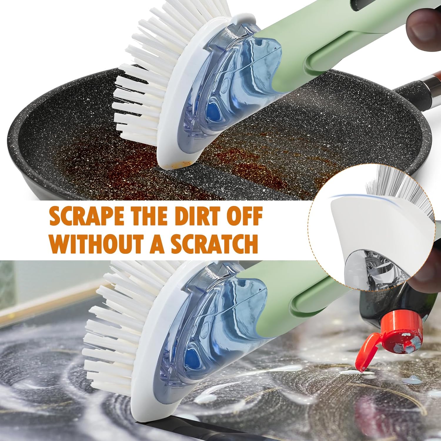 - Built-in Scraper: The kitchen sink brush with handle helps to remove the food stuck on it, and the kitchen scrubber brush can be safely used in a non-stick pan.