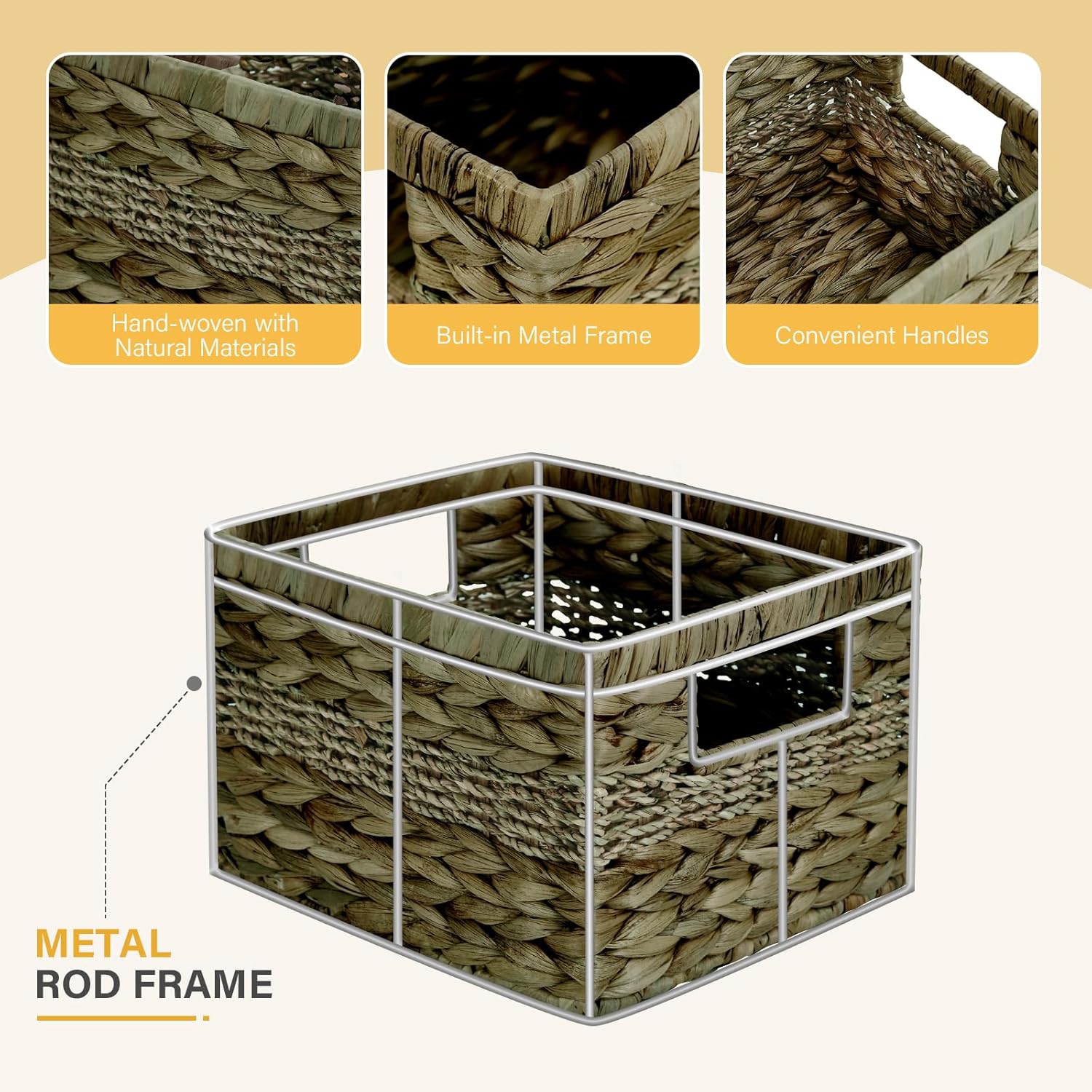 - βChic Basket Design: With natural materials design, this water hyacinth and seagrass basket with built-in handles complements any home decor style. Shelf baskets' earthy tones and organic texture add a touch of warmth and charm to your living space, while its practical shape make it a functional addition to any room.