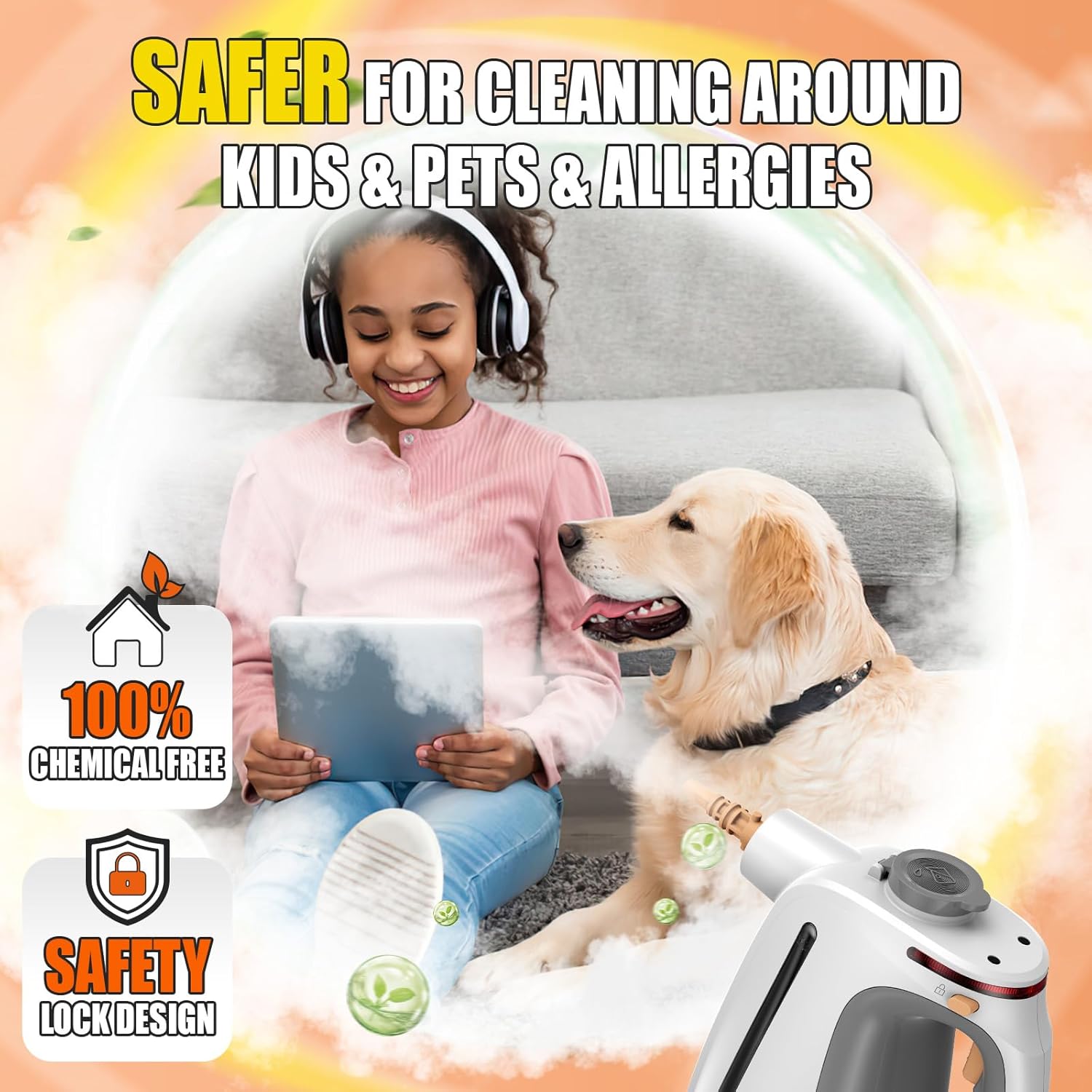 • NATURAL 100% CHEMICAL-FREE & SAFE CLEAN: Embrace a healthier cleaning approach with our deep steam cleaner, which offers a 100% chemical-free cleaning solution; Harnessing the power of steam, without chemicals, making it safe for your family and pets