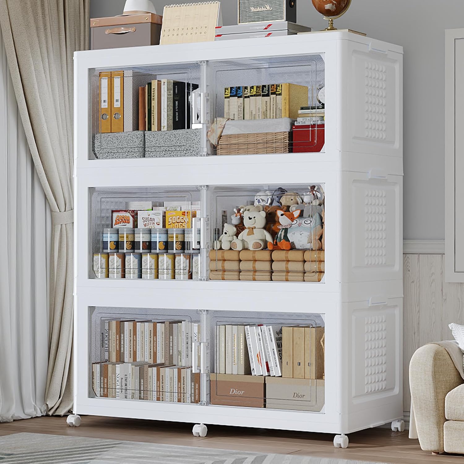 • 【Foldable, Stackable, Mobile, No Assembly】Our stackable storage bins open front can be quickly unfolded or collapsed in just 3 minutes to maximize space utilization. It can be stacked layer by layer into a cabinet, with side buckles to secure each level in place, preventing tipping or scattering. The bottom is equipped with 6 universal wheels for easy mobility. An essential large storage bin for homes and dorms.
