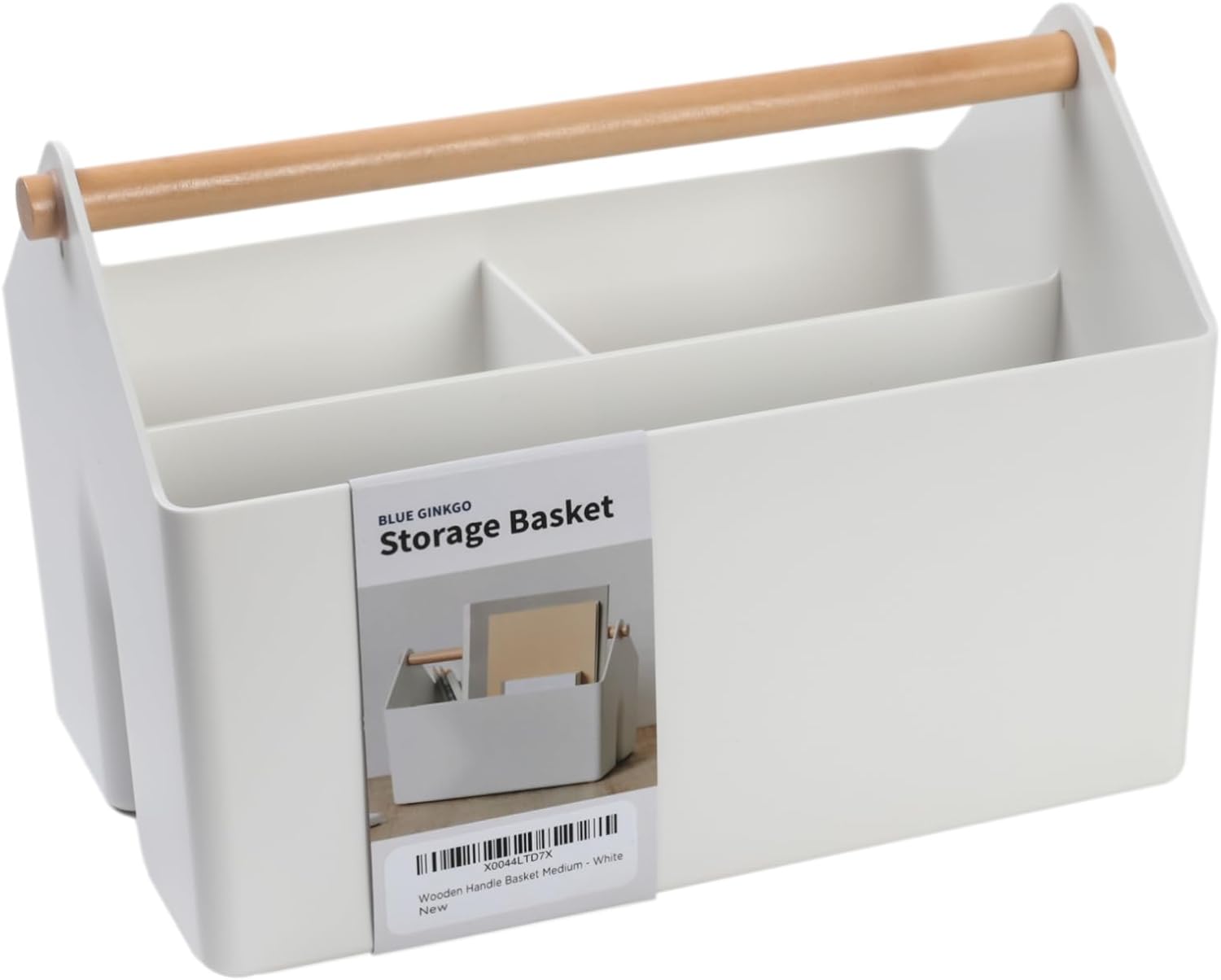 BLUE GINKGO Medium Storage Basket – Plastic Caddy with Wooden Handle for Office, Arts & Crafts, or Home Supplies (White)