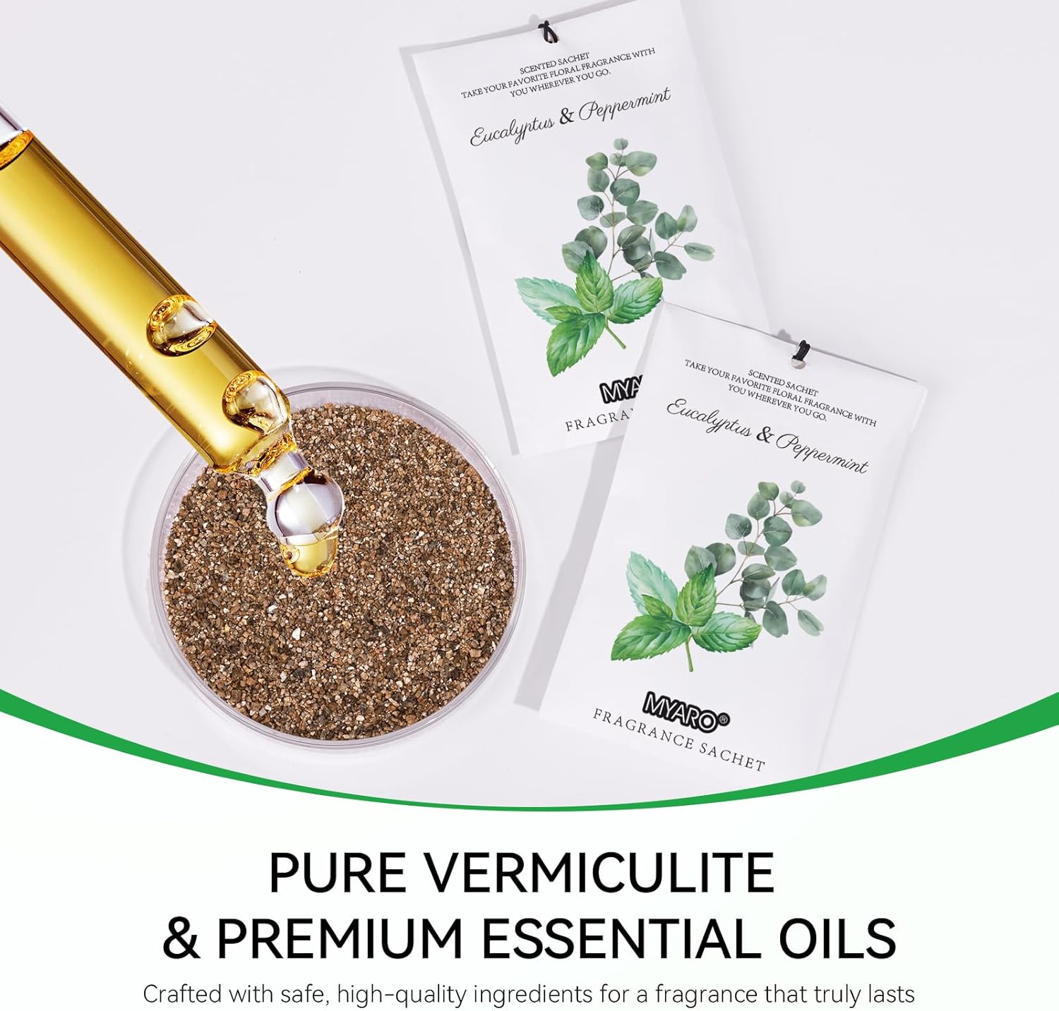 • MYARO Eucalyptus Mint Sachet Bags: Includes 12 scented sachets (each bag size: 4.13 inch x 2.76 inch). Our natural fragrance will take you on a journey with the fresh scents sachet packets