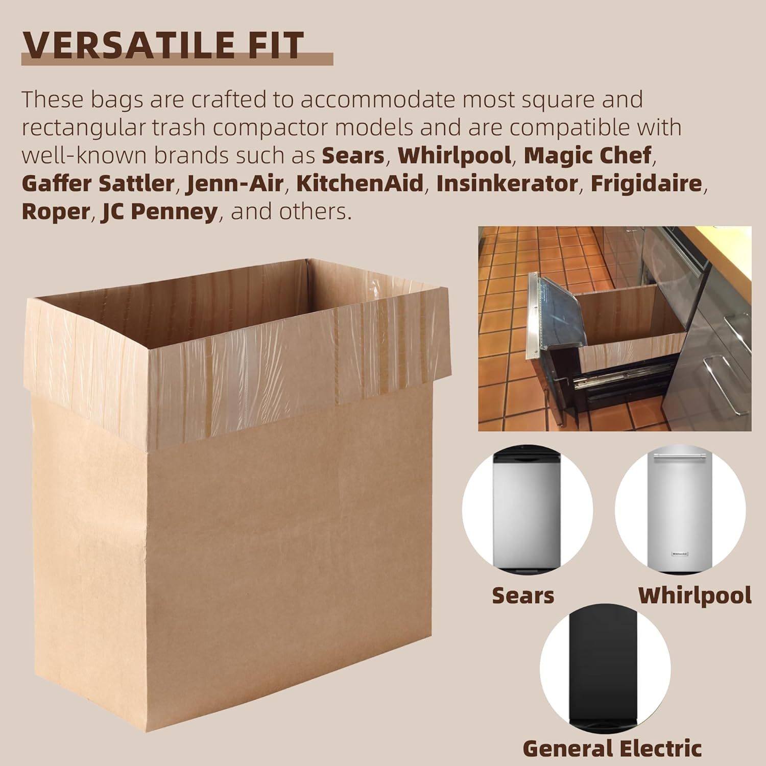 • Just the Right Fit: These compactor bags are crafted to accommodate most square and rectangular trash compactor models and are compatible with well-known brands such as Sears, Whirlpool, Magic Chef, Gaffer Sattler, Jenn-Air, KitchenAid, Insinkerator, Frigidaire, Roper, JC Penney, and others