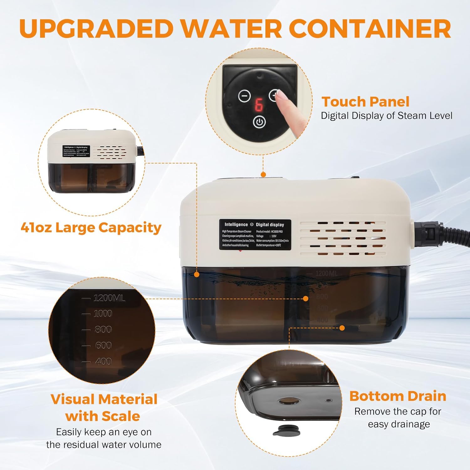 • **Easy to Operate: Simply fill the 1.2L (41oz) water container, turn on the switch, and adjust the steam output via touch panel or steam gun button. Features an LED digital display for precise control.