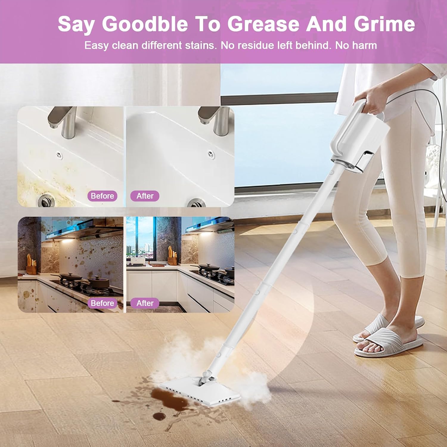 - 🧼 【Fit Multi-Surface and Multi-Purpose Use】 Steam mop with attachments includes 2 machine-washable pads and 7 attachments for floors (hardwood, laminate, tile, marble), windows, showers, kitchens, and even clothing care. Dirt and oil grime, water stains cleaning is not the hard thing again!