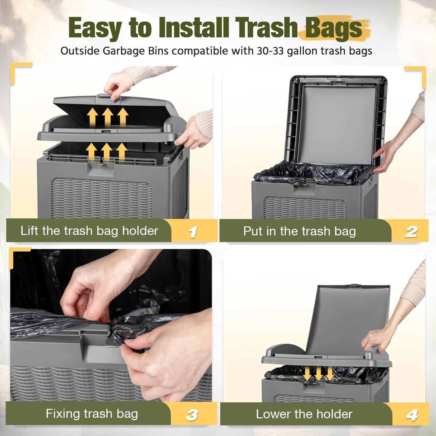 • Smart Dual Lid Design: This trash can designed with Innovative dual lid hides trash bags for a tidy yard, the outer lid opens and closes easily with one hand and keeps out odors, the inner lid stabilizes trash bags in place