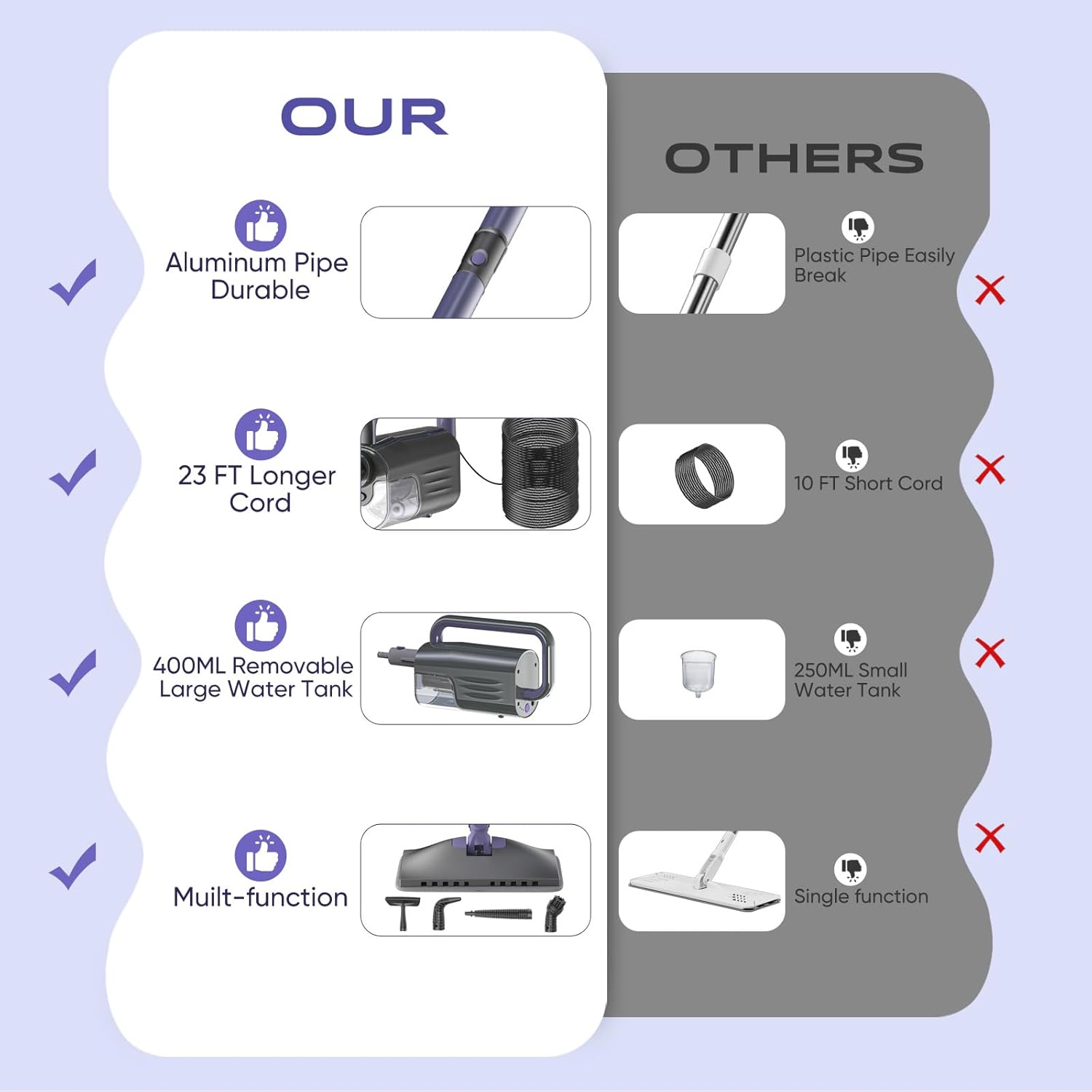 • LIGHTWEIGHT & FLEXIBLE STEERING : Our Steam Mop Cleaner equipped with dual cleaning modes, you can choose different mode to fit your needs. The extended 23FT power cord and rotating steam mop cleaner head. With 180-degree horizontal and 135-degree vertical rotation, make cleaning corners and edges a breeze.